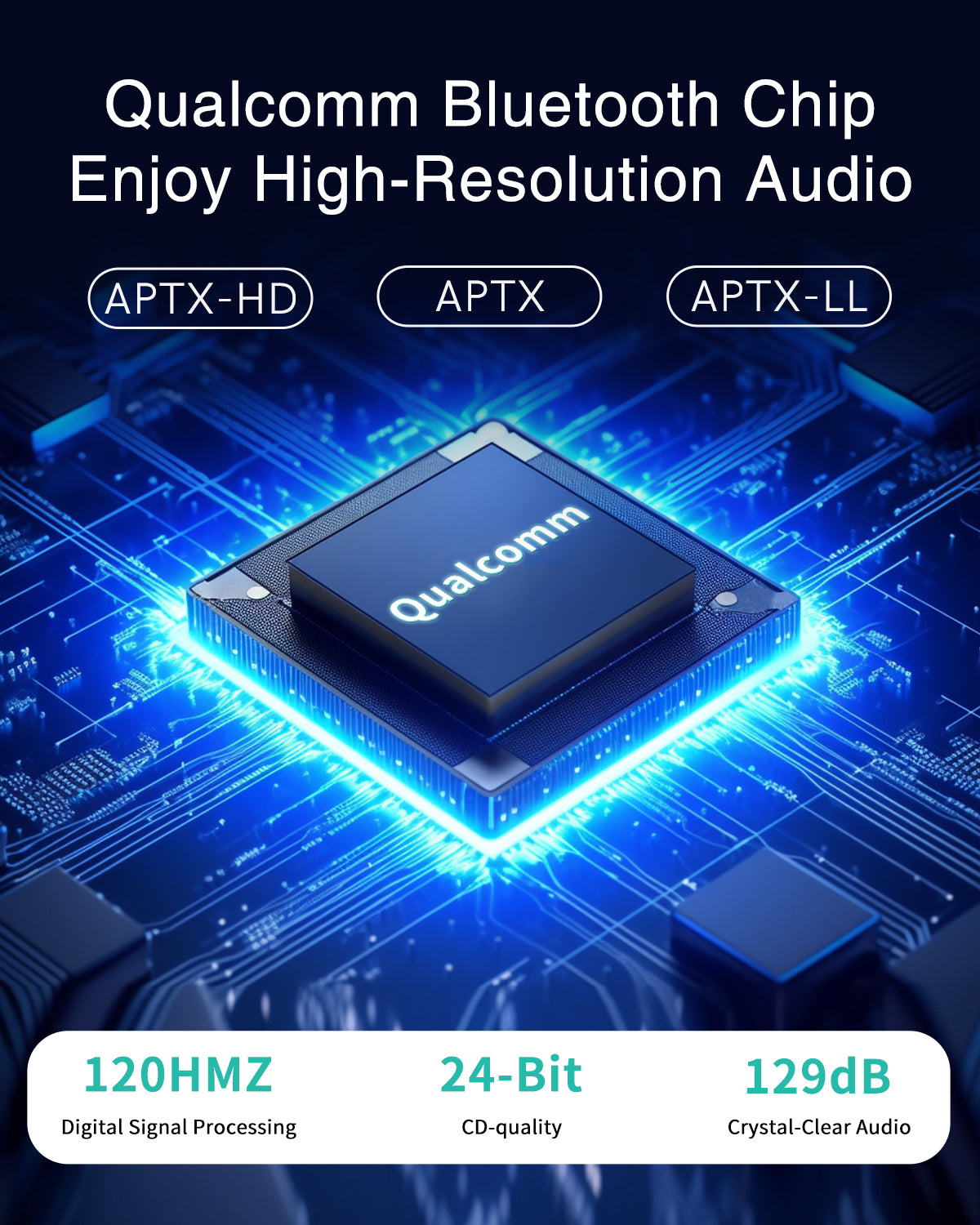 Next-gen wireless audio: Powered by Qualcomm chip technology with 24-bit audio and 120MHz DSP for enhanced clarity. Supports aptX , aptX-LL, aptX-HD formats for seamless, lag-free streaming.