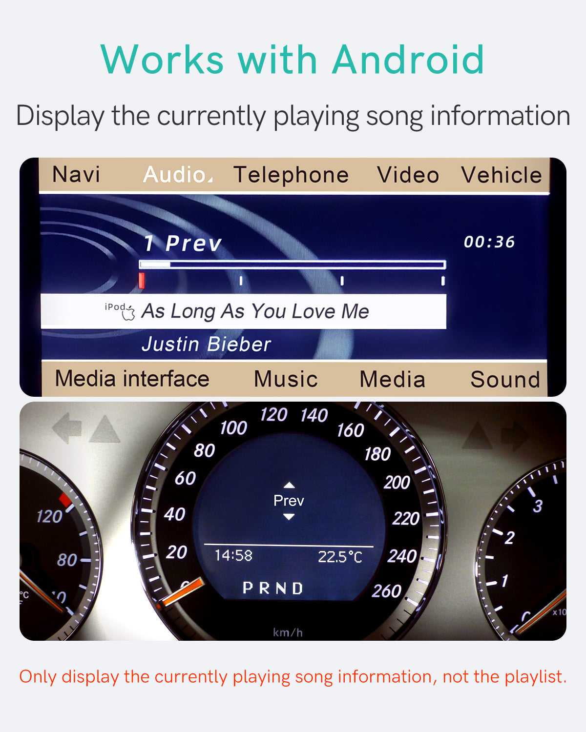 Track Details on Car Screen – Displays playlists via iPhone apps* and shows artist/title for streaming services. Works with iOS & Android. (*Playlist feature limited to iPhone).