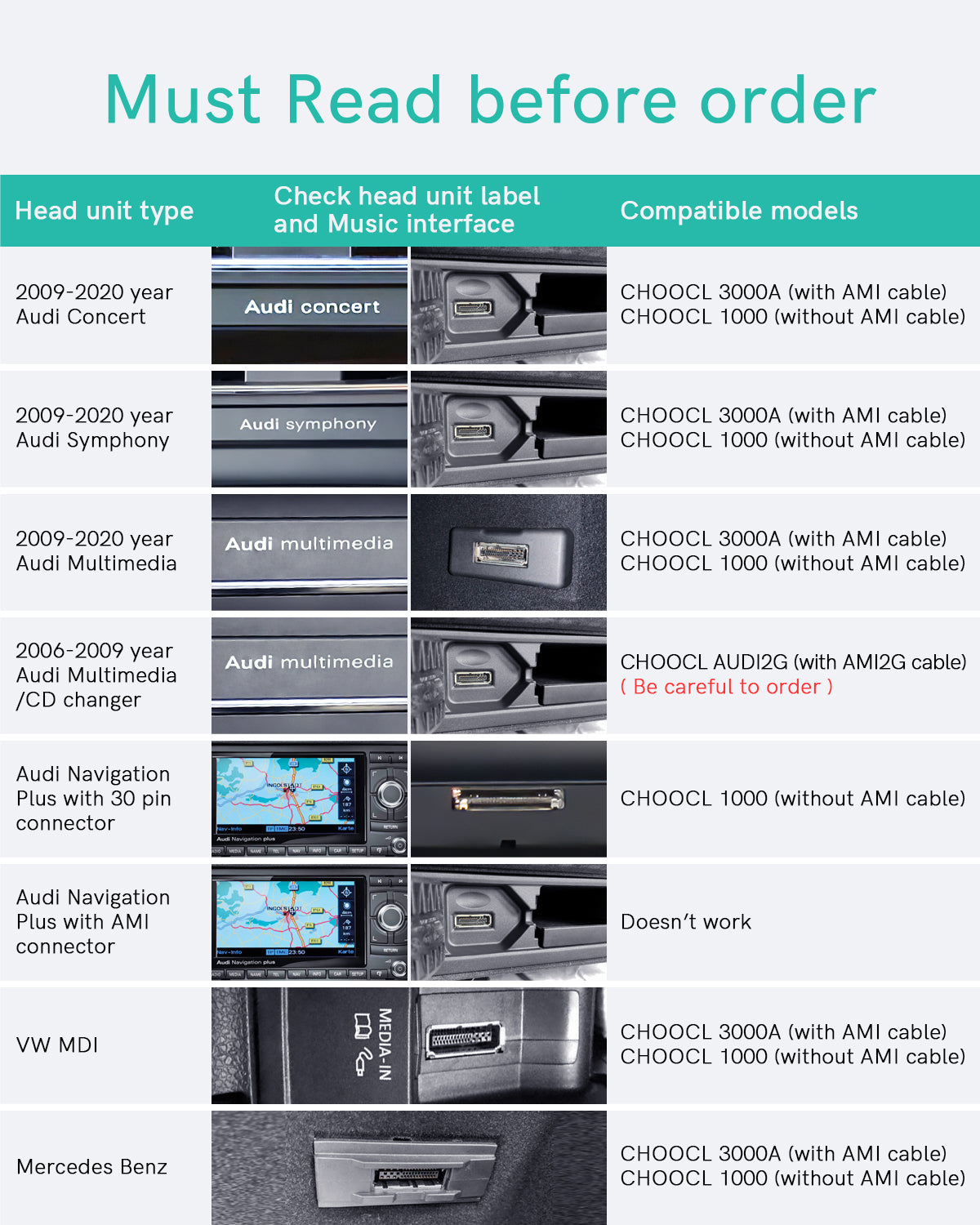 CHOOCL Bluetooth 5.0 aptX-HD adapter for Audi with 30-pin connection cable (2010-2019), MMI 3G system, Bluetooth receiver for Mercedes with original iPod interface cable (2005-2011)