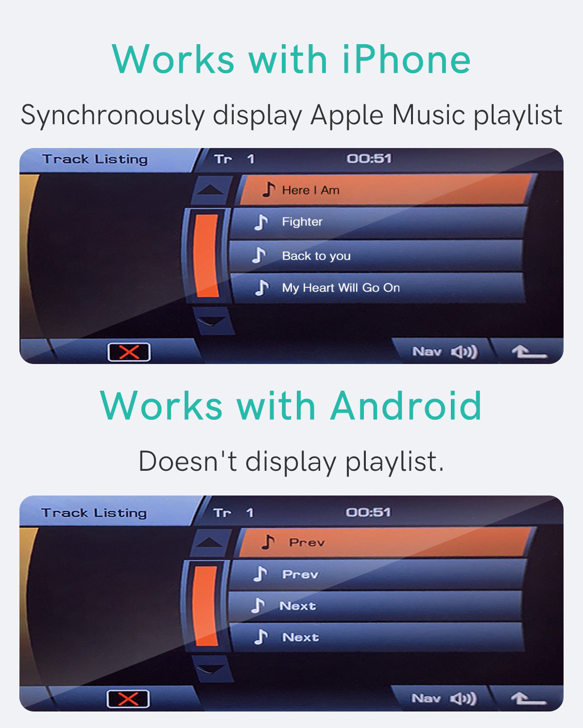 Track Details on Car Screen – Displays playlists via iPhone apps* and shows artist/title for streaming services. Works with iOS & Android. (*Playlist feature limited to iPhone).