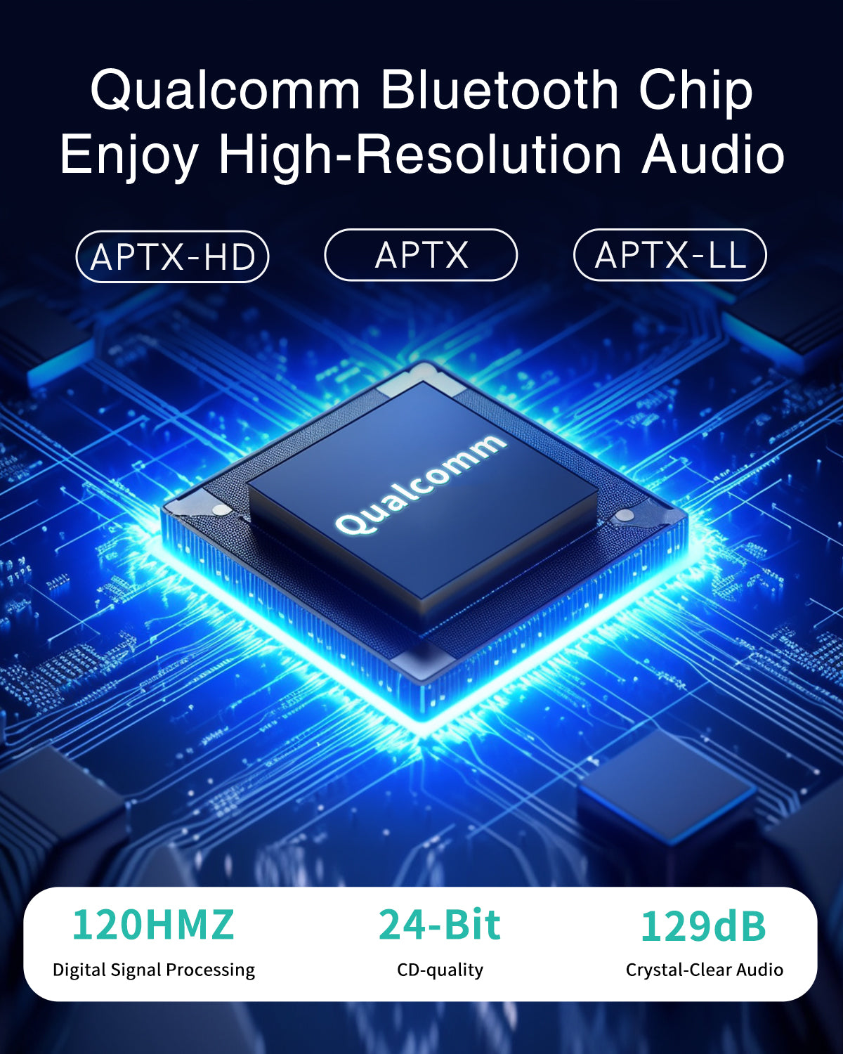 Enhance Your Audio Experience:Featuring a high-performance Qualcomm CSR8675 chip for superior sound quality. Supports 24-bit audio processing, 120MHz DSP, and high-quality wireless audio formats including aptX, aptX Low Latency, and aptX HD for crystal-clear sound.
