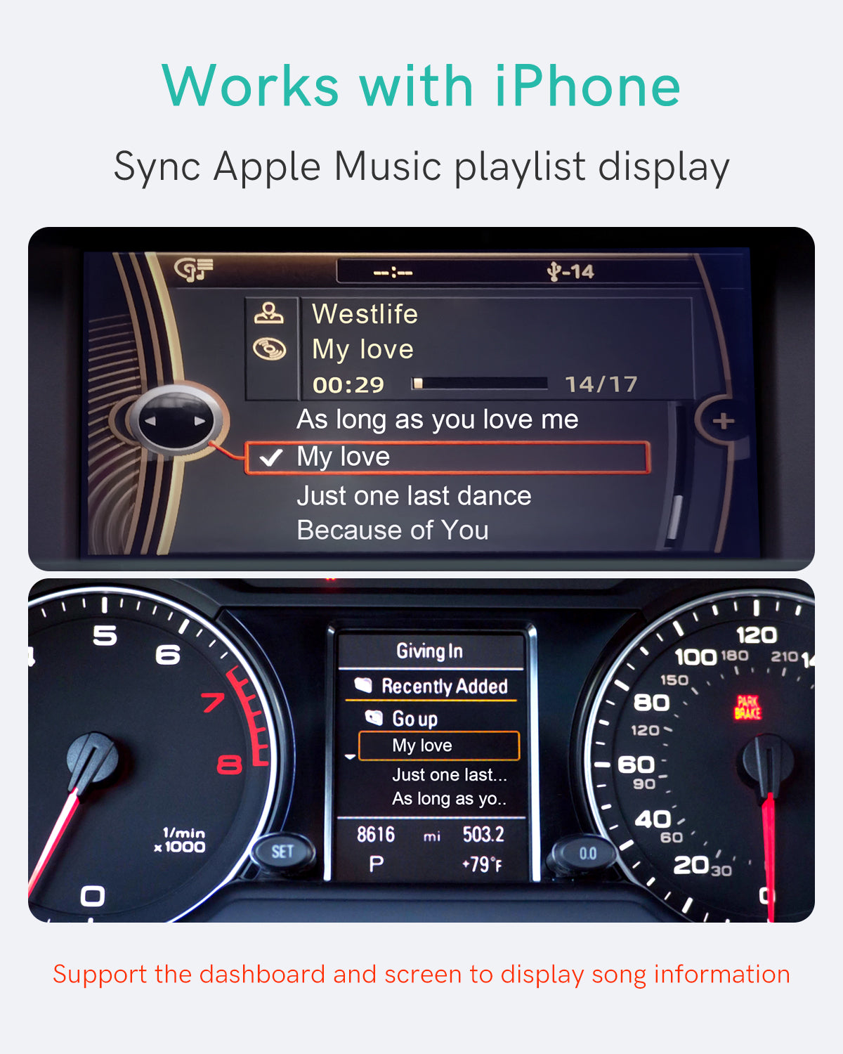 Display Song Information on Your Car Screen: Compatible with Music to show playlists (iPhone only). Works with Spotify and Pandora to display current track details like artist and song title (playlists not supported). Supports both iPhone and Android devices.
