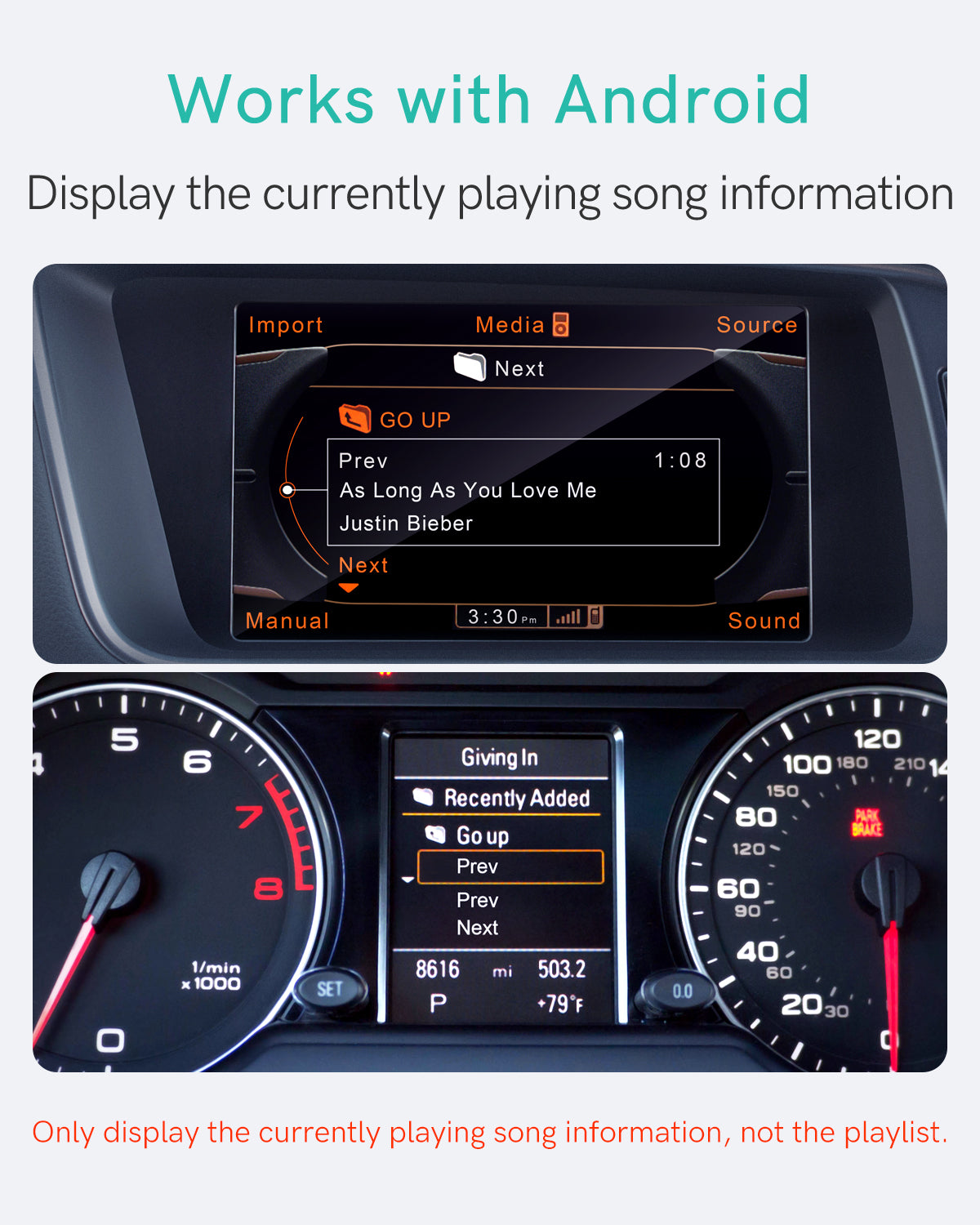 [Track Details on Your Car Screen] Shows playlists via iPhone apps* and artist/title for streaming services. Works with iOS & Android. (*Playlist feature limited to iPhone).