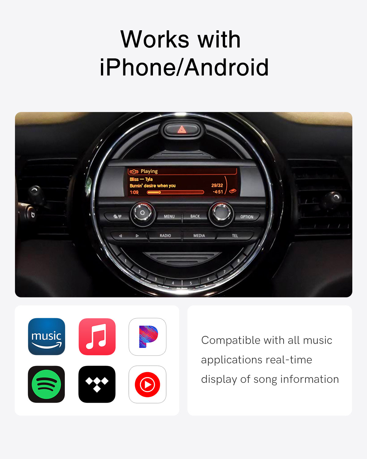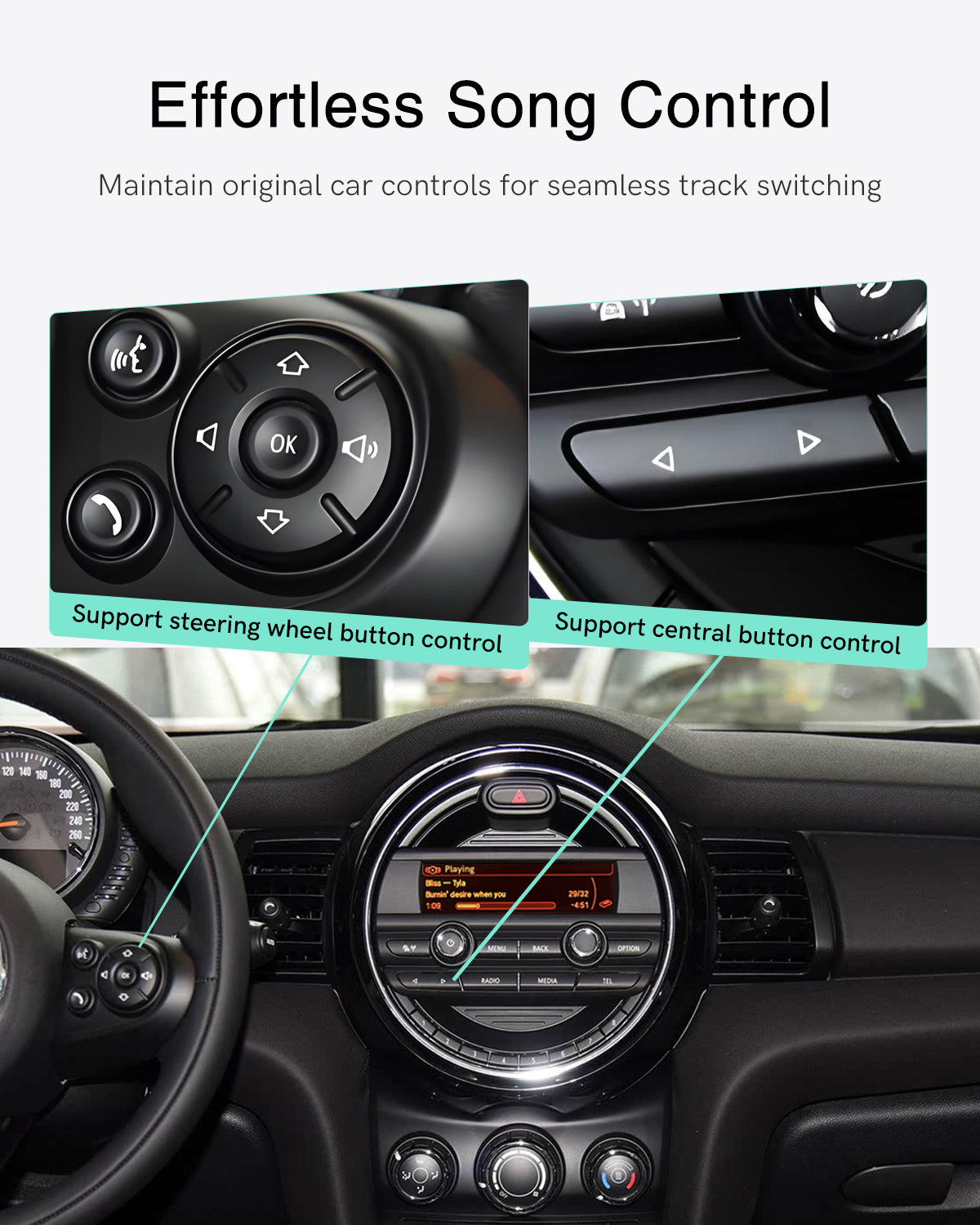 Steering Wheel and Original Multimedia Buttons to Control Songs:Supporting the steering wheel or the original car multimedia buttons to easily switch the previous/next music, so that you can keep your hands off the steering wheel, safe control of the music, and enjoy a more focused, more enjoyable driving experience.